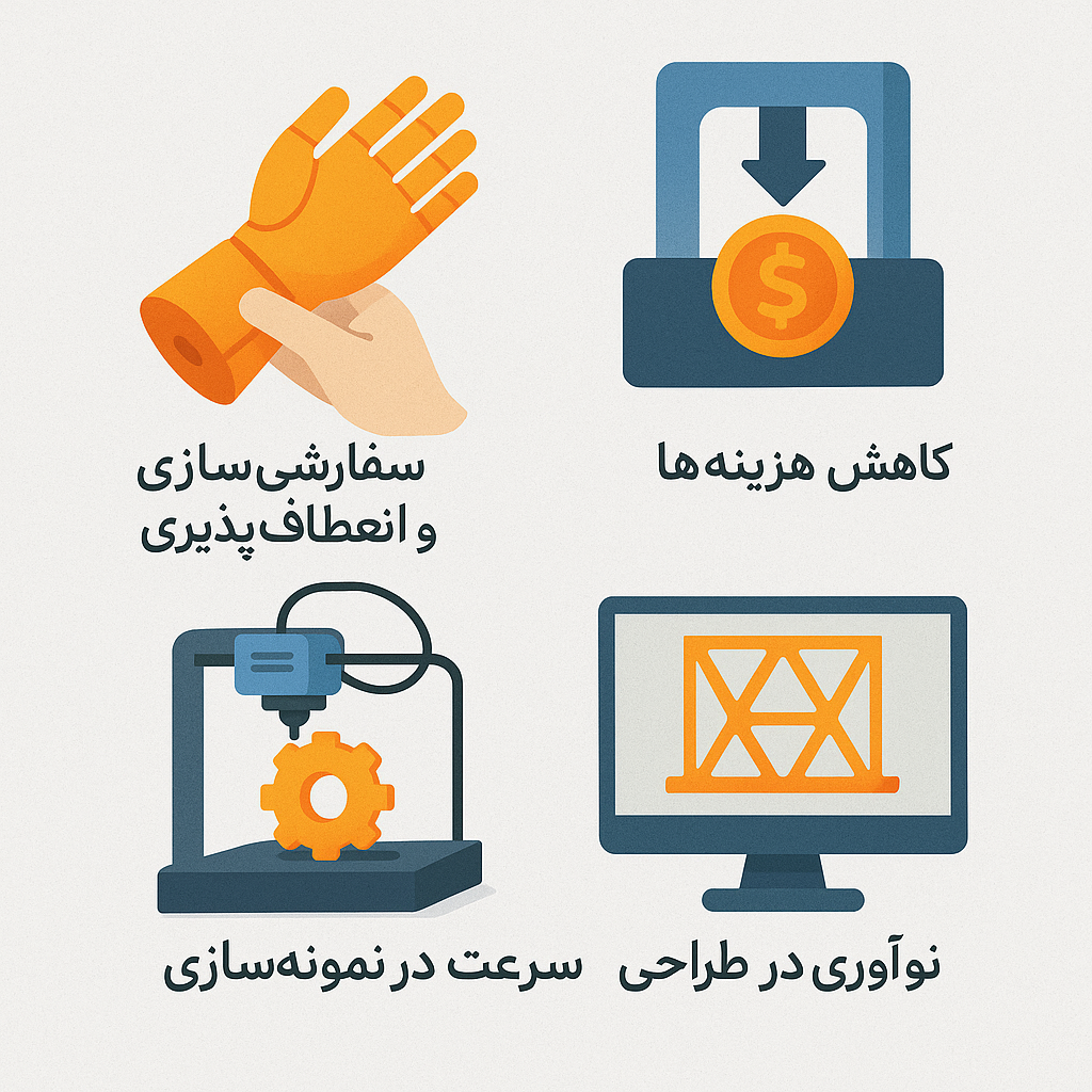 فناوری پرینت سه‌بعدی طی یک دهه اخیر تحولی بزرگ در صنایع مختلف ایجاد کرده است. این فناوری با استفاده از مدل‌های سه‌بعدی دیجیتال، امکان تولید قطعات، ابزارها و حتی محصولات کامل را فراهم می‌کند. مزایای این روش تنها به سرعت و دقت محدود نمی‌شود، بلکه ابعاد گسترده‌ای از نوآوری، صرفه‌جویی اقتصادی و کاربردهای متنوع را پوشش می‌دهد.